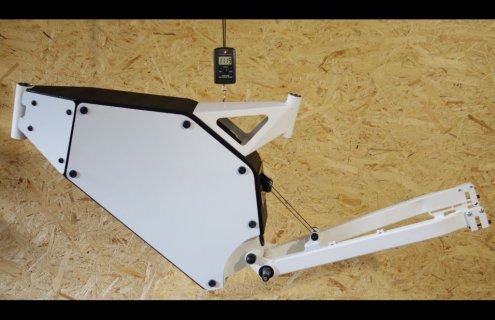 Изготовлена из стали, что обеспечивает ремонтопригодность при механических повреждениях. Окрашена стойкой к царапинам порошковой эмалью. Боковые накладки изготовлены из легкого материала дибонд. Вес рамы без аммортизационной подвески составляет 10кг.